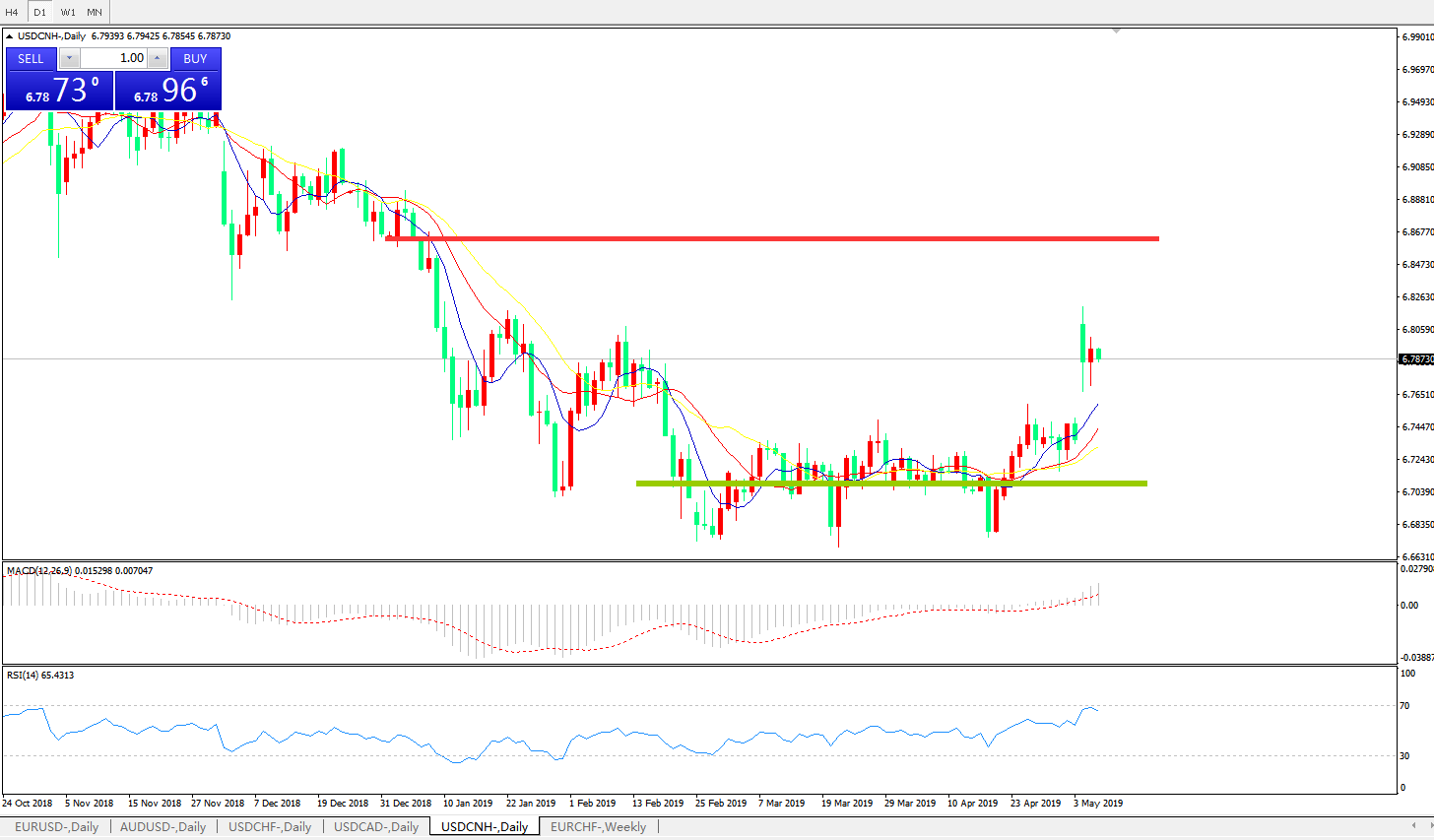 交易策略: 在6.6990之上,看涨,目标价位为6.7845,然后为6.8200。