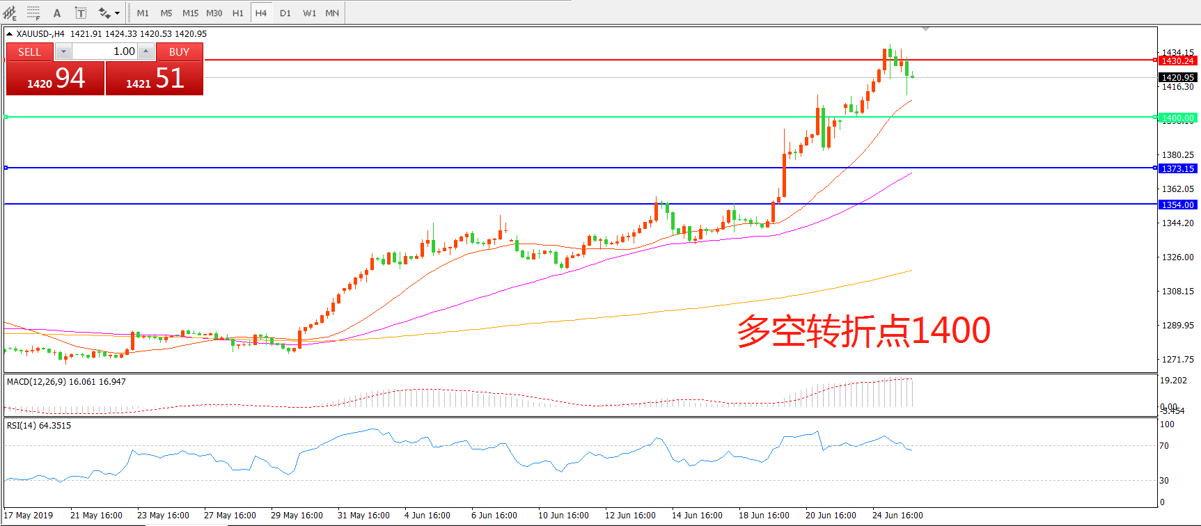 现货黄金周二(6月25日)一度走高,逼近1440美元/盎司关口,但鲍威尔的一番讲话让黄金短线快速“跳水”,最终收报1420.28美元/盎司。美联储主席鲍威尔在出席纽约外交关系委员会的活动中强调, 美联储不受短期政治压力的影响,暗示7月份不一定降息。鲍威尔和讲话之后,美指快速拉升38点,现货黄金短线急跌逾约20美元,随后震荡收复,但日内涨幅基本被吞没。