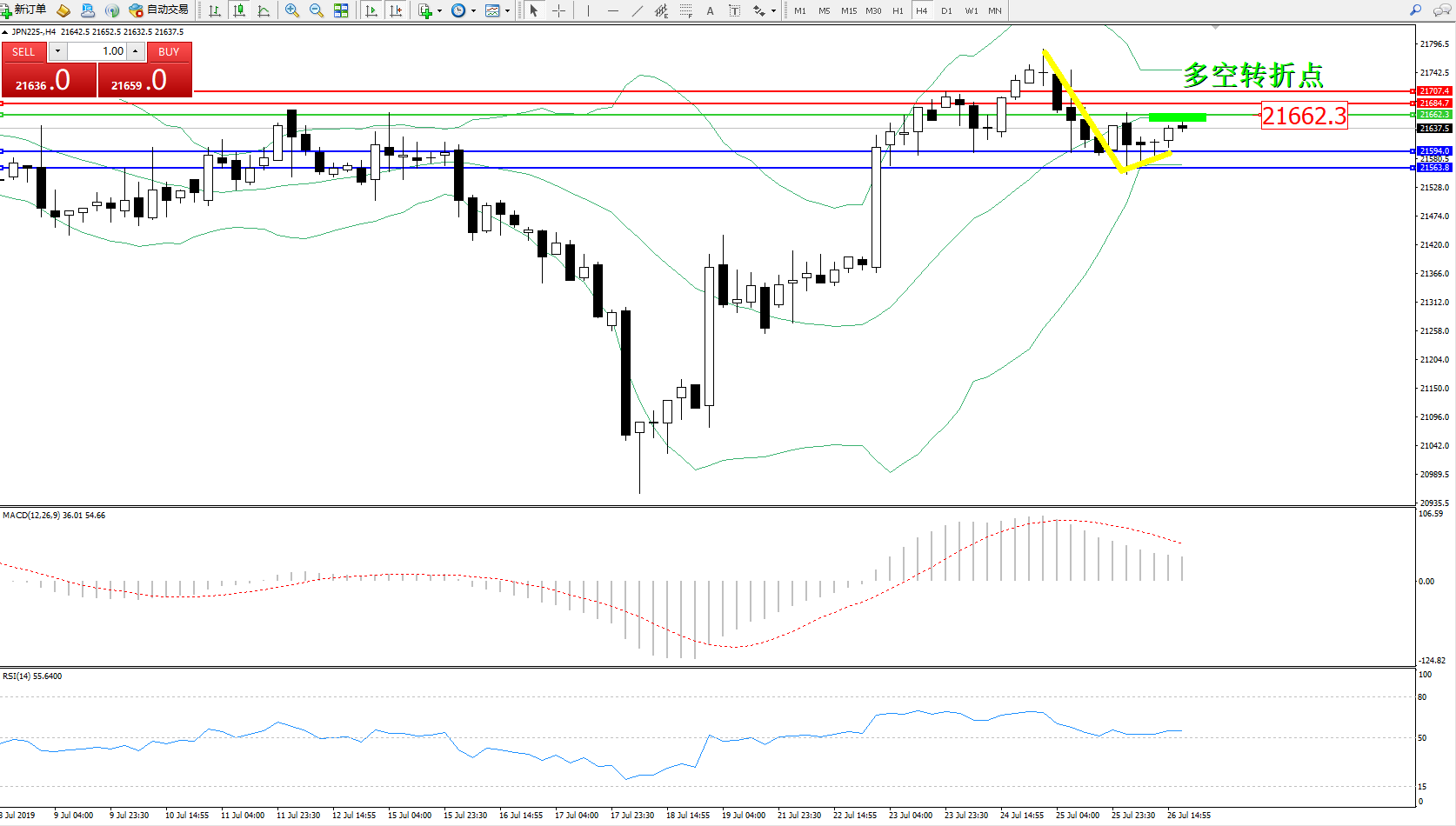 日经225指数7月26日(周五)收盘下跌96.55点,跌幅0.44%,报21660.00点。日本6月工业生产料翻跌,零售销售增长亦料失速;对今年日本经济造成沉重压力,出口大受影响,制造业信心跌至三年低点。日本央行部分官员据称怀疑加强前瞻指引的效果;如果在下周的政策会议上加强央行对利率的承诺,其收效可能甚微。