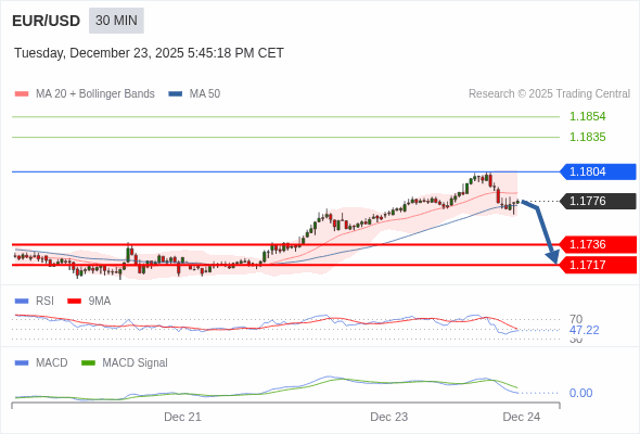 欧元/美元 当日内 : 逐渐下跌,当 1.1804 阻碍上行,则 1.1717 为目标位。