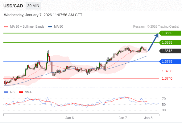 在 1.3785 之上,看涨,目标价位为 1.3835 ,然后为 1.3860 。