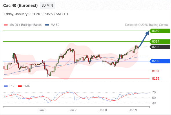 法国CAC指数期货 (Euronext) (F6) 当日内: 在8230之上,看涨。