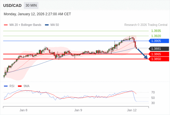在 1.3905 之下,看跌,目标价位为 1.3865 ,然后为 1.3850 。