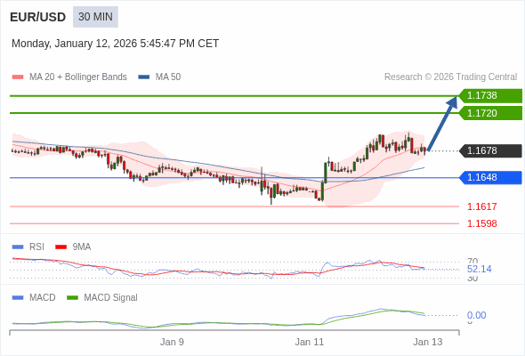 欧元/美元 当日内 : 看涨,当 1.1648 为支撑位,目标定在1.1738。