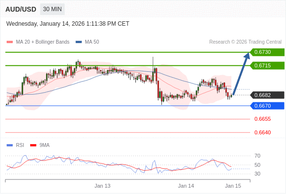 在 0.6670 之上,看涨,目标价位为 0.6715 ,然后为 0.6730 。
