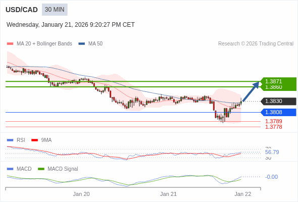 美元/加元 当日内 : 看涨,当 1.3808 未被跌破。