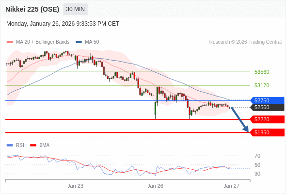 交易策略: 在 52750 之下,看跌,目标价位为 52220 ,然后为 51850 。