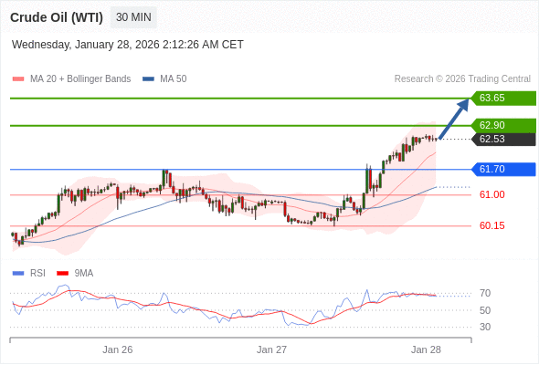 在 61.70 之上,看涨,目标价位为 62.90 ,然后为 63.65 。