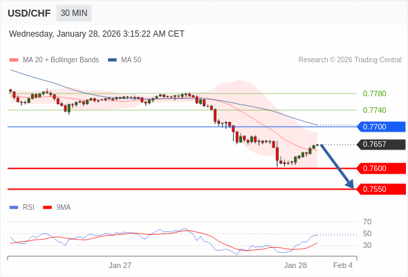 在 0.7700 之下,看跌,目标价位为 0.7600 ,然后为 0.7550 。