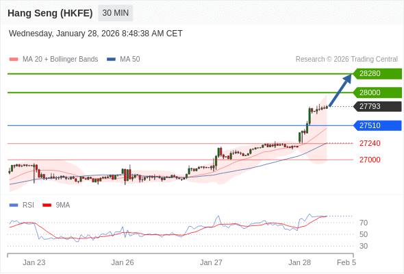 交易策略: 在 27510 之上,看涨,目标价位为 28000 ,然后为 28280 。