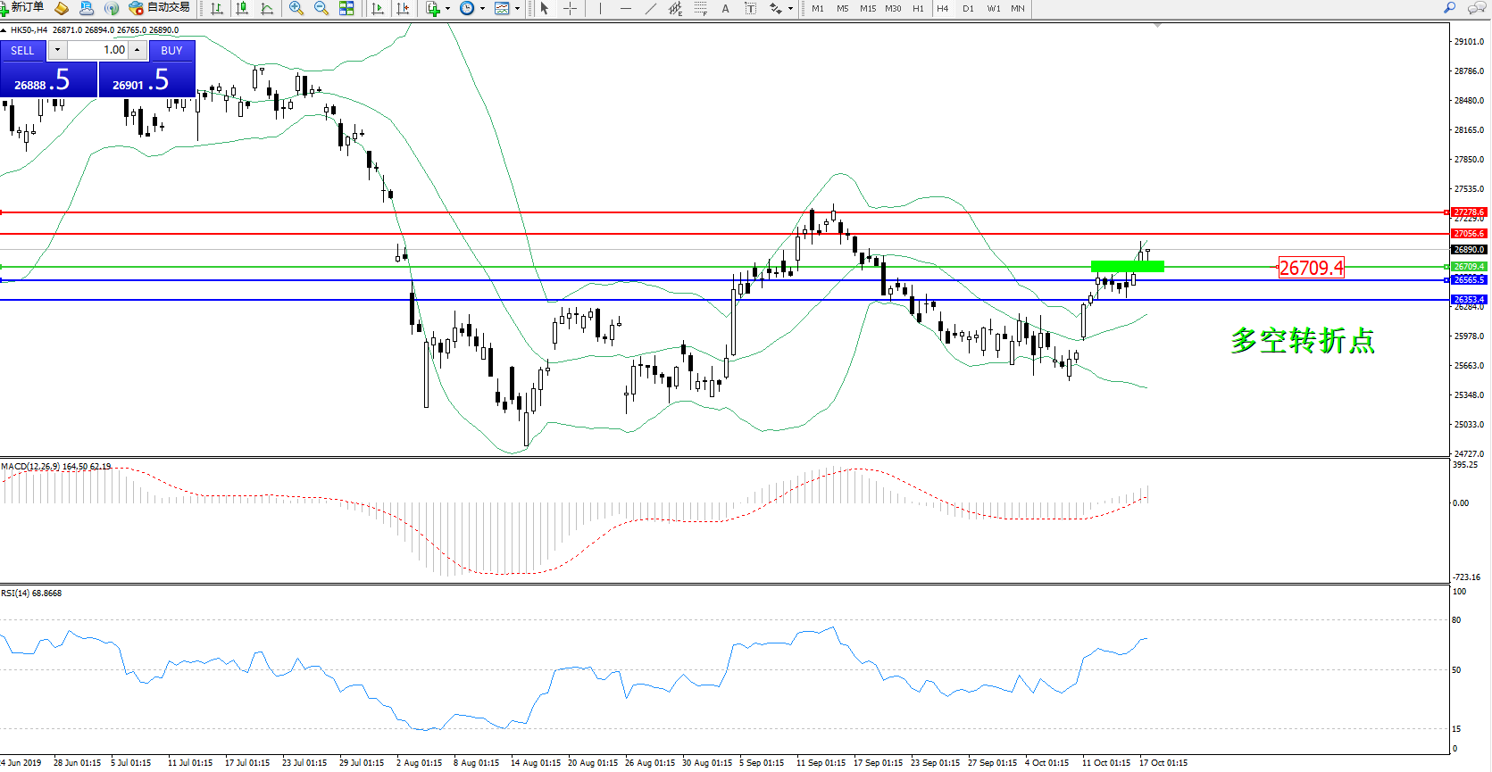 香港恒生指数1017日(周四)收盘上涨184.21点,涨幅0.69%,报26848.49点;港股早间高开后,曾小量收窄升幅,随后再穏步上扬,恒指拉高26956位置,距离27000点近在咫尺。唯关口前略见压力,始终未能冲破。美国零售销售数据自今年2月以来首次下滑,加剧经济忧虑,市场对美国连续第三次降息的预期也有所升温。人民币汇价近日亦有转弱迹象,某程度上亦会不利恒指表现,因此恒指能否进一步上升仍有待观察。