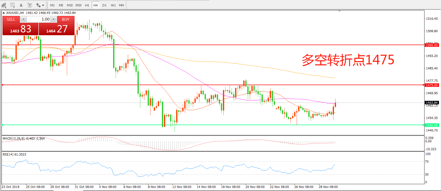 美联储暂缓降息,贸易谈判向好进程得以继续推进令黄金的避险吸引力黯然失色,现货黄金11月份累计跌幅近4%,并创下8月初以来新低,但上周五的英国恐怖袭击事件为金价提供了一定支撑,现货黄金小幅反弹,收报1463.83美元/盎司,本周一系列重磅事件接踵而至,非农就业报告、OPEC大会、ISM制造业指数、英国大选......风云际会之时,大行情一触即发!