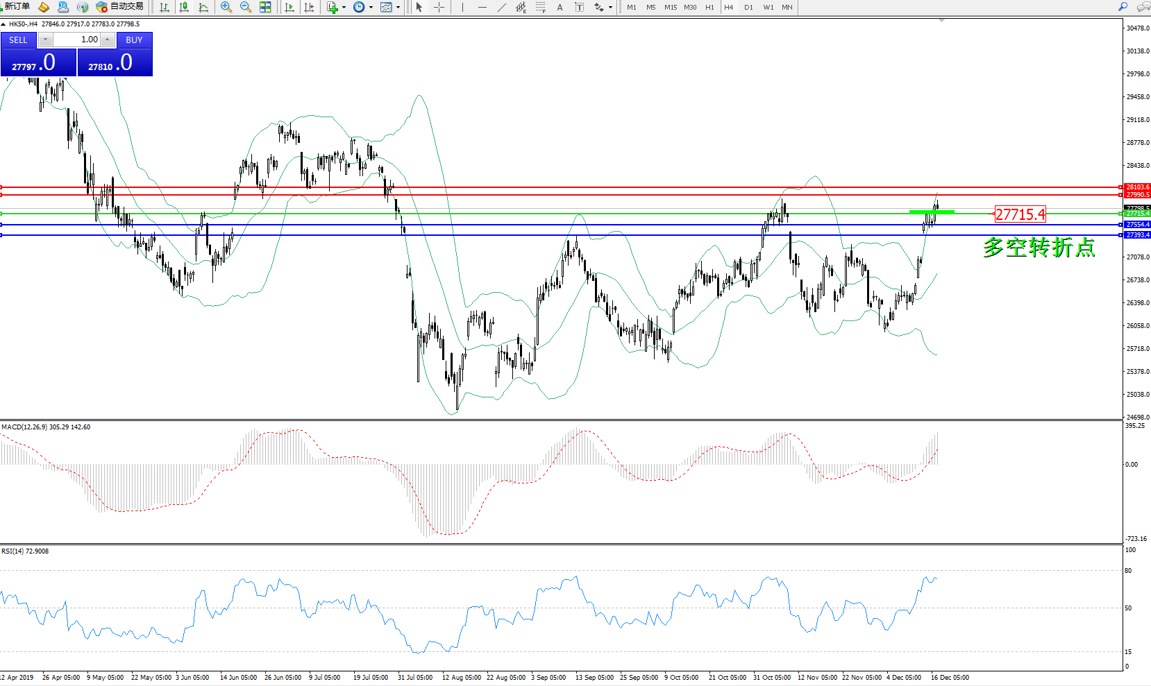 香港恒生指数1217日(周二)收盘上涨335.62点,涨幅1.22%,报27843.71点;港股跟随外围造好而高开122点,再扩大涨幅后受压震荡,曾回落收窄升幅至仅升55点。低位见有买盘支持再抽升,恒指最高触及27785。恒指昨日一如预期出现高位调整,隔夜美股再创新高,这可能会继续带动今日市场积极投资情绪。在外围股市向好、市场信心恢复之下,港股的做多动力会持续增强,恒指向上的中线趋势不会改变。目前国际贸易前景不确定性仍存,部分投资者仍在评估协议成效。