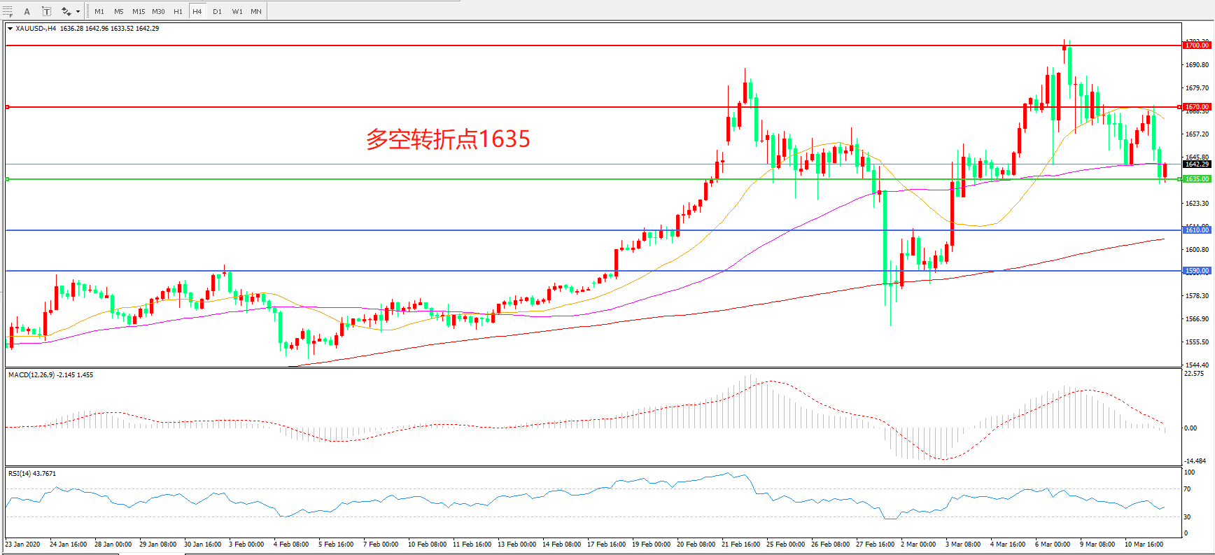 4小时图看,金价冲高回落,有形成头肩顶的迹象,短期涨势暂缓,均线系统走平,MACD红柱减少,绿柱增加,RSI指标向上,日内重点关注1635一线得失。