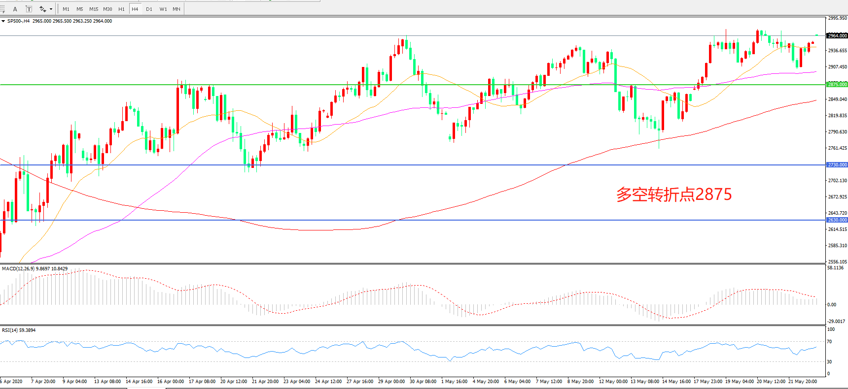 4小时图看,标普500呈现高位震荡形态, 多空博弈十分焦灼,2970成为上方阻力。55周期均线成为下方支撑,MACD红柱减少,RSI指标走平,日内延续震荡概率较大。