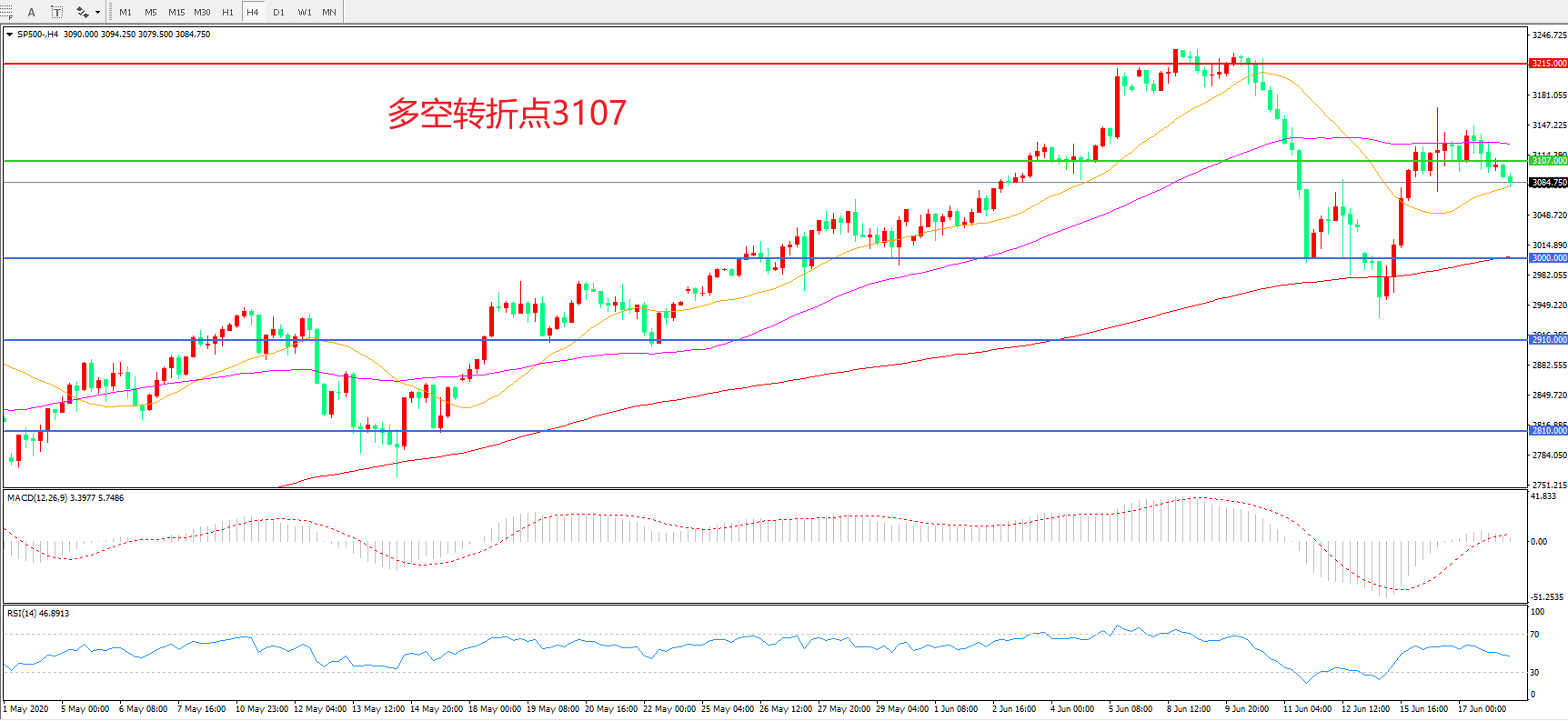 4小时图看,标普500震荡回落,整体呈现高位震荡形态,55周期均线成为阻力,MACD红柱缩短,RSI指标走平,日内延续下行概率较大。
