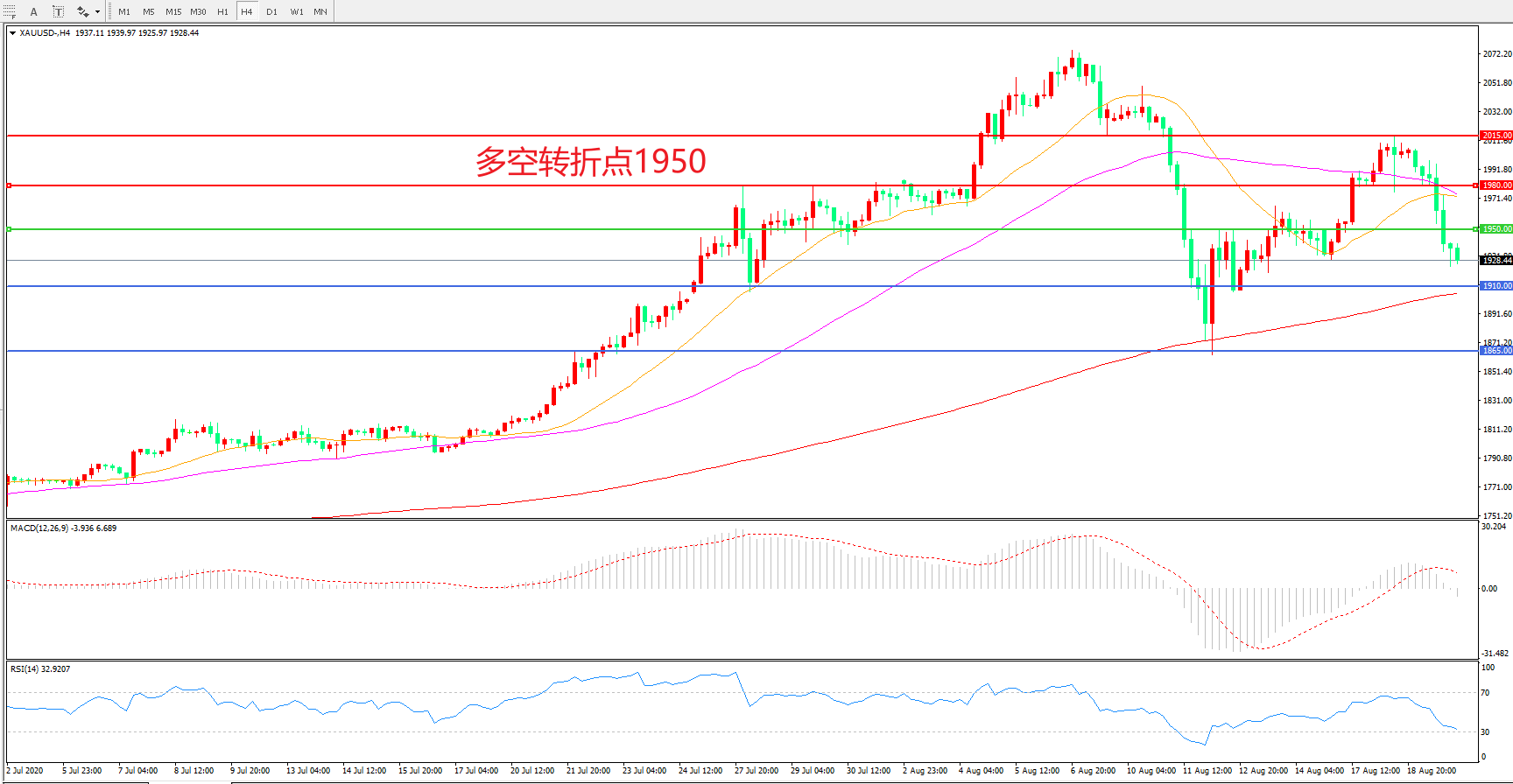 交易策略: 在1950.00之下看跌,目标1910.00 1865.00
