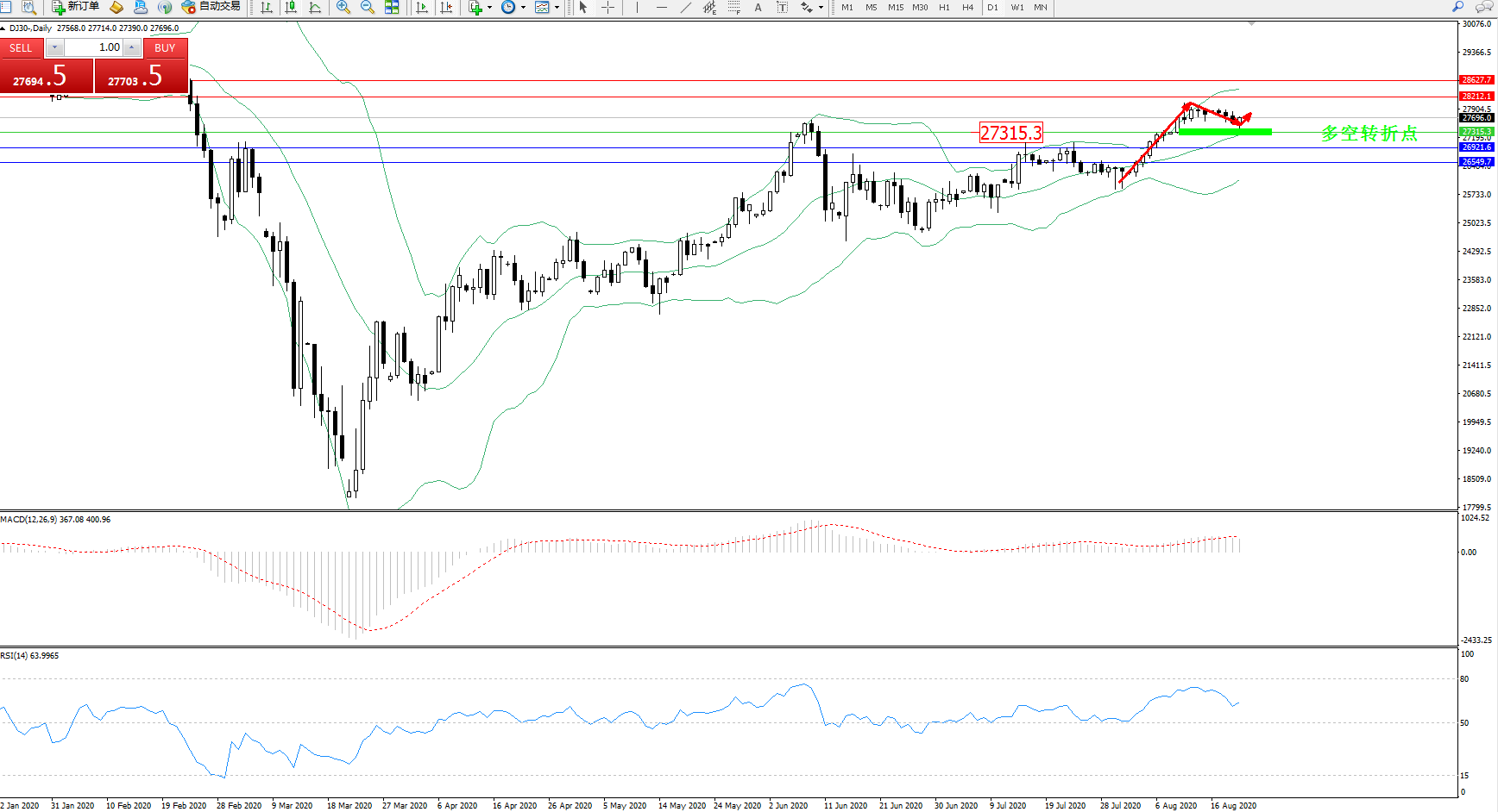 道琼斯指数8月20日(周四)收盘上涨46.80点,涨幅0.17%,报27739.73点。美股三大指数全线收高,美国股市攀升,大型科技股推动纳斯达克100指数创出纪录新高,盖过投资者担忧经济从新冠疫情中复苏将需要更多时间的影响。苹果和特斯拉等重量级股票纷纷攀升,抵消了能源和银行股下滑的影响。华尔街对互联网和软件公司获利潜力的痴迷似乎仍然存在;得益于稳健的资产负债表和受益于社交疏离措施的一系列产品,科技股扩大了今年来的涨幅,美国公布上周初请失业金人数出人意料地再次突破100万,且美联储会议记录重申了对经济复苏的担忧,苹果、亚马逊和微软股价上涨,推高了美国三大股指,这种冒险走势降低了对美元的需求。但美元指数仍较周二触及的两年低点92.124高出约0.70%,美联储会议记录和周四出炉的疲弱就业数据持续发酵。