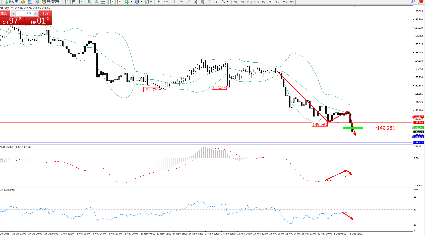 交易策略:149.281下方看跌,目标148.572、148.122