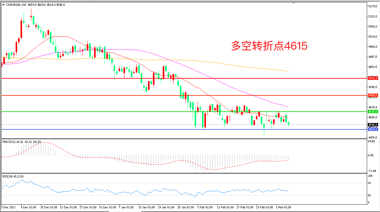 4小时图看,沪深300 区间震荡迹象明显,4615成为上方阻力,4520成为下方支撑, MACD绿柱增加,RSI指标走平,日内延续震荡概率较大。