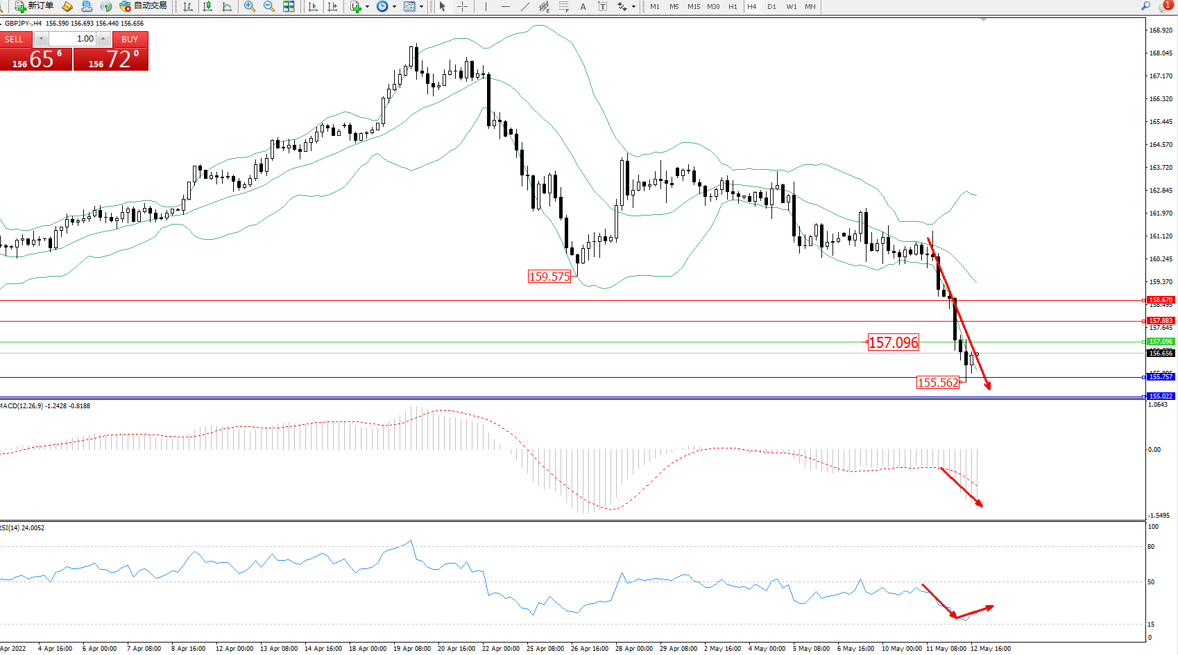 交易策略:157.096下方看跌,目标155.757、155.022