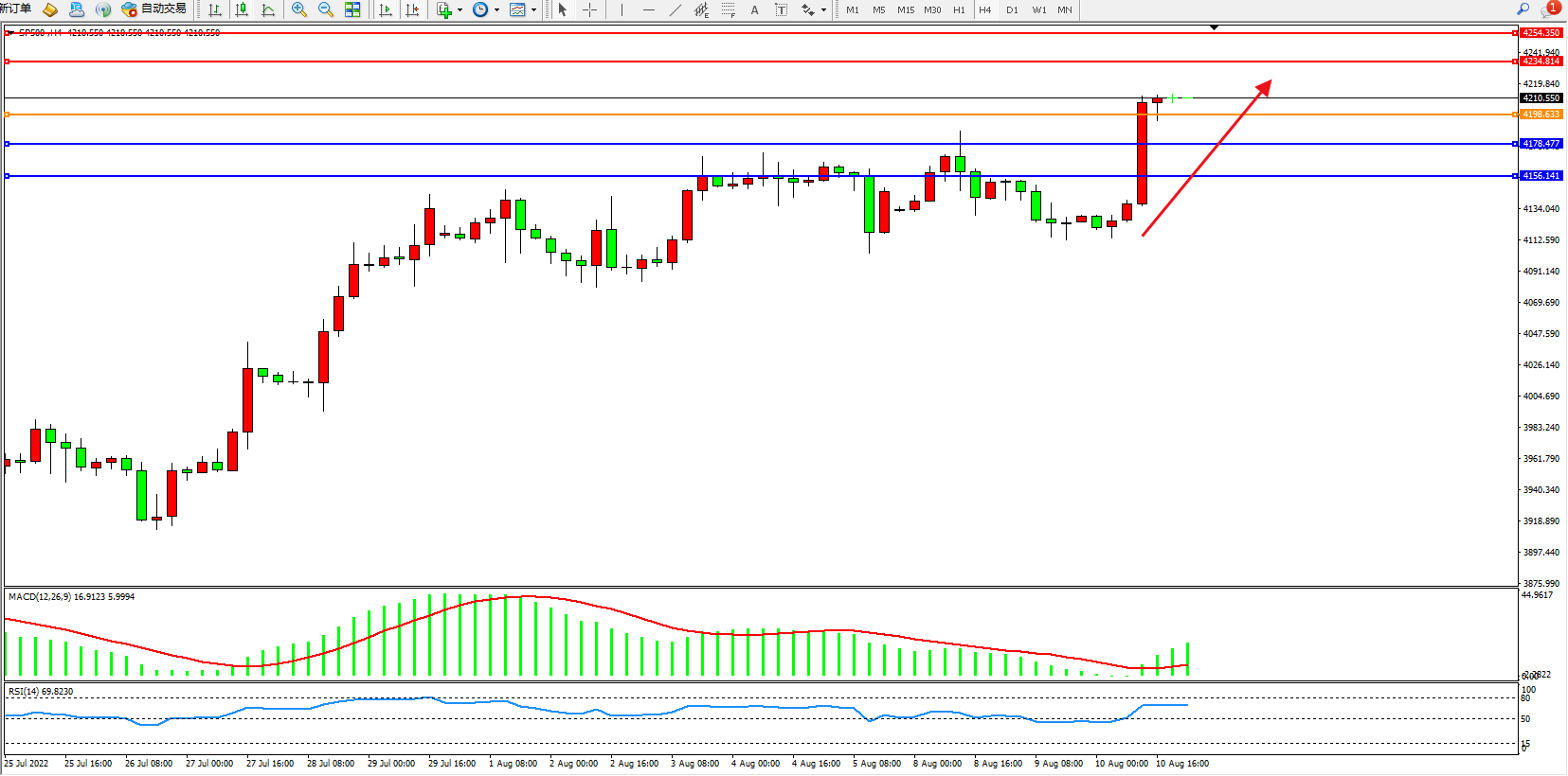 标普SP500——4小时K线图显示: