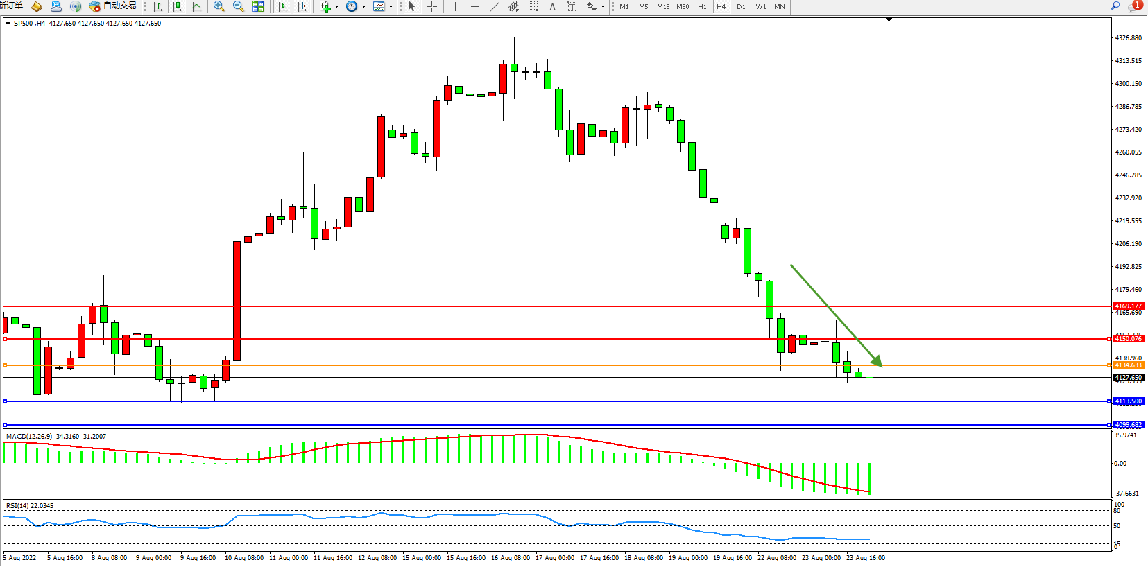 标普500指数8月23日(周二)收盘下跌10.73点,跌幅0.26%,报4127.26点;交易员对美联储9月加息50个基点还是加息75个基点意见不一,最近几位政策制定者对联储政策将出现鸽派转向的预期进行了反击,并强调了美联储抗击通胀的承诺。