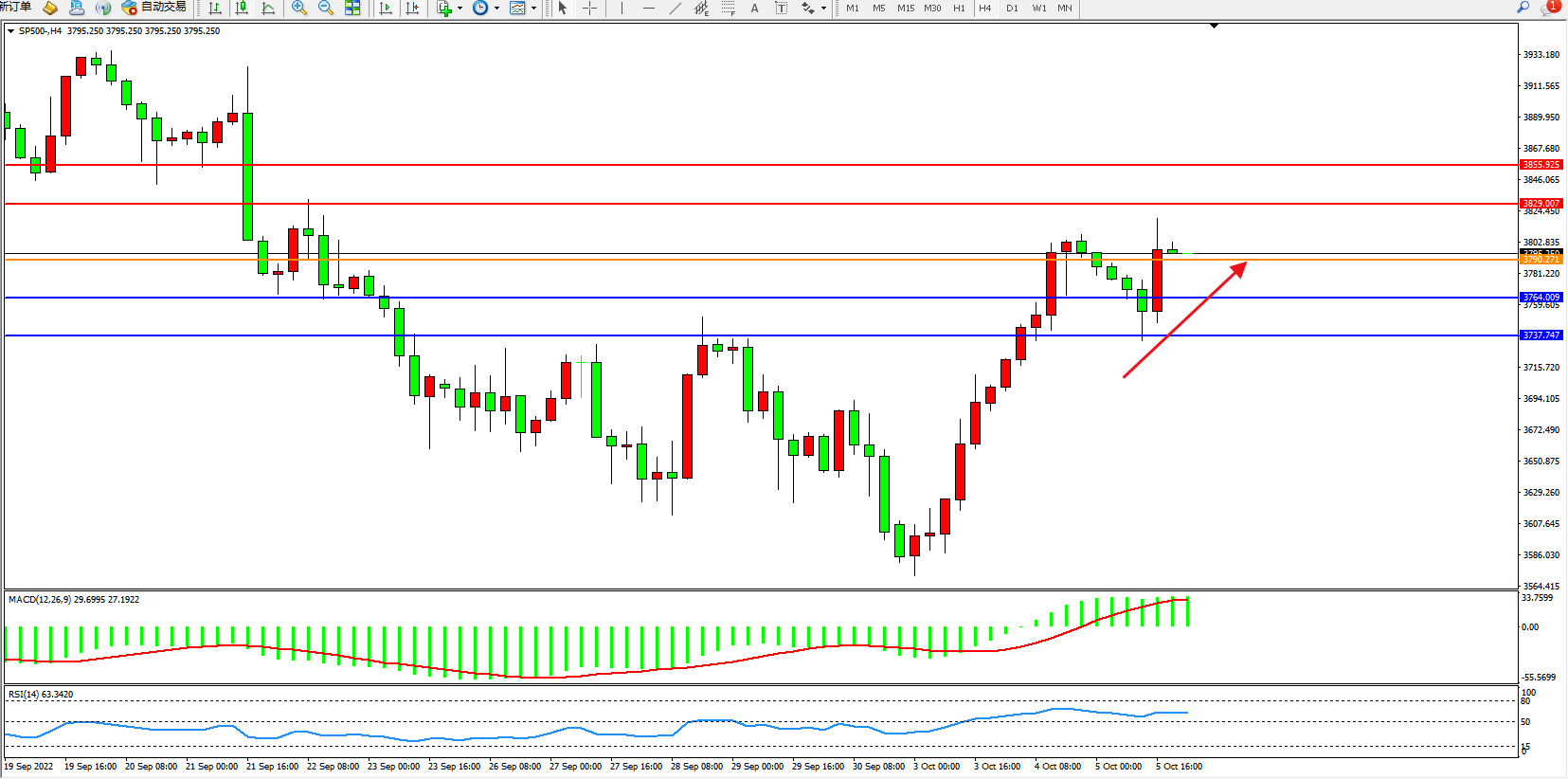 标普SP500——4小时K线图显示: