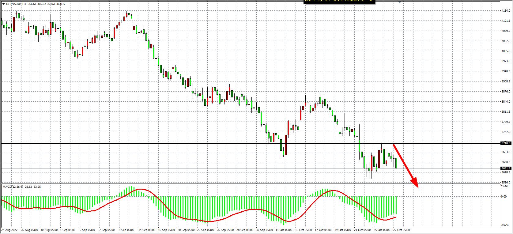 1小时图看,沪深300反弹至3710附近再度出现受阻回落,同时MACD在零轴之下量能依旧较大,显示行情反弹过后仍有进一步走低的需求,大空头趋势仍未变,日内在3710之下继续看跌为主,下方目标3600-3550,若意外上破3710则看3800-3560附近。