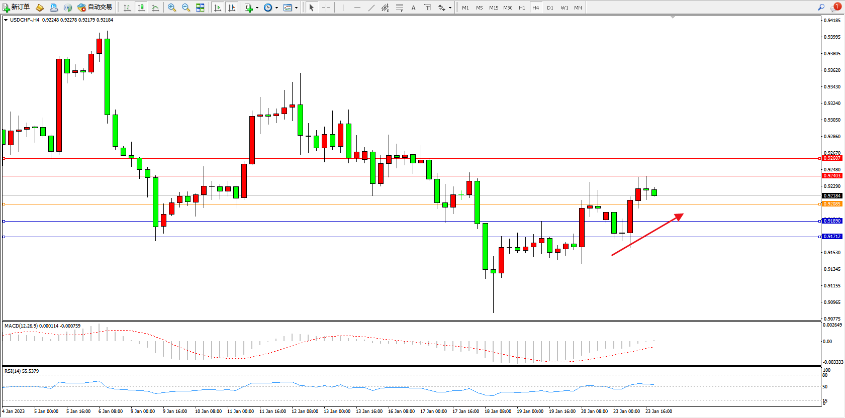 美元瑞郎USDCHF——4小时K线图显示: