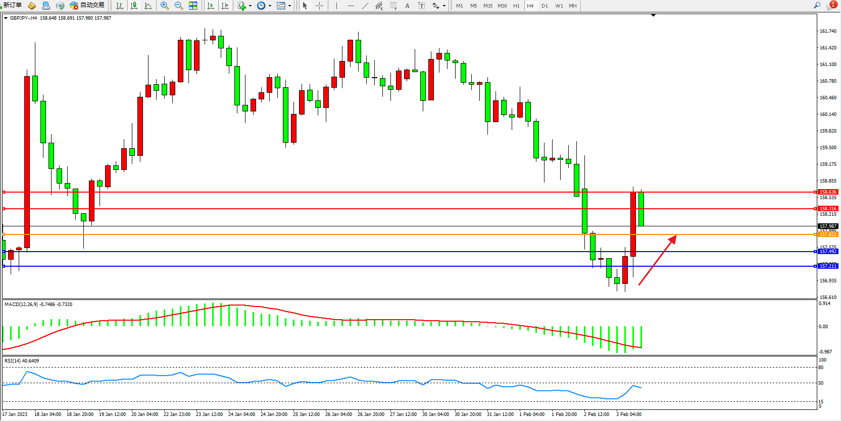 备选策略:157.822下方看跌,目标157.492、157.211