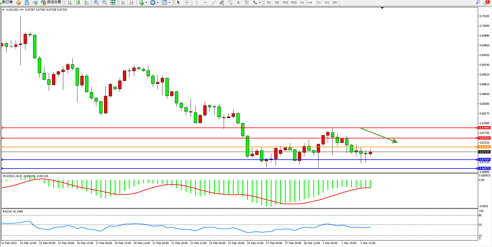交易策略:0.67441下方看跌,目标0.67164、0.66970