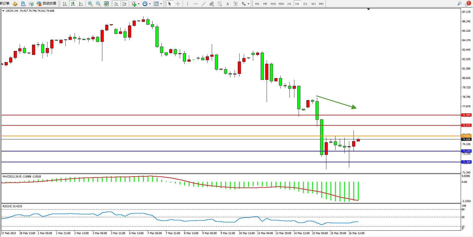 交易策略:74.933下方看跌,目标73.439 72.369