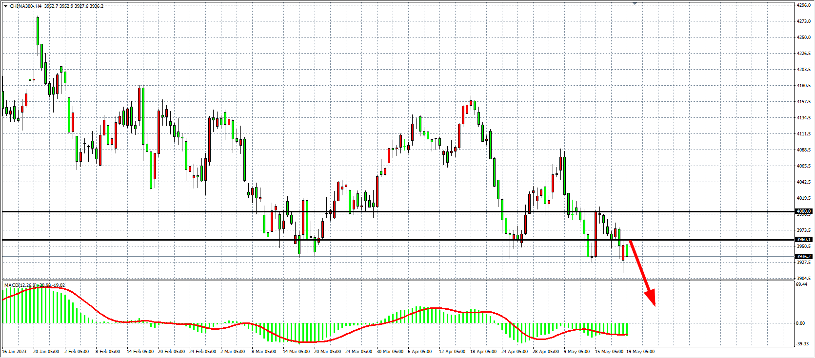 4小时图看,沪深300进一步走低,MACD量能在零轴下持续放量,行情走势偏弱,阻力关注3960点,该位之下继续看跌3900-3850附近,