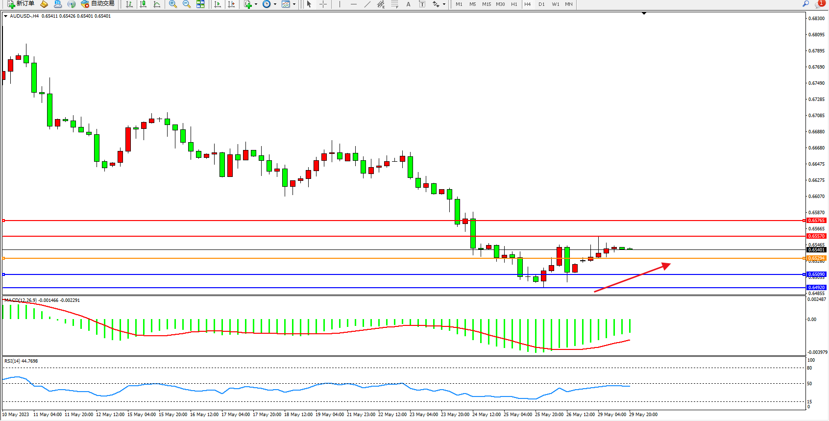 交易策略:0.65294上方看涨,目标0.65570 0.65765