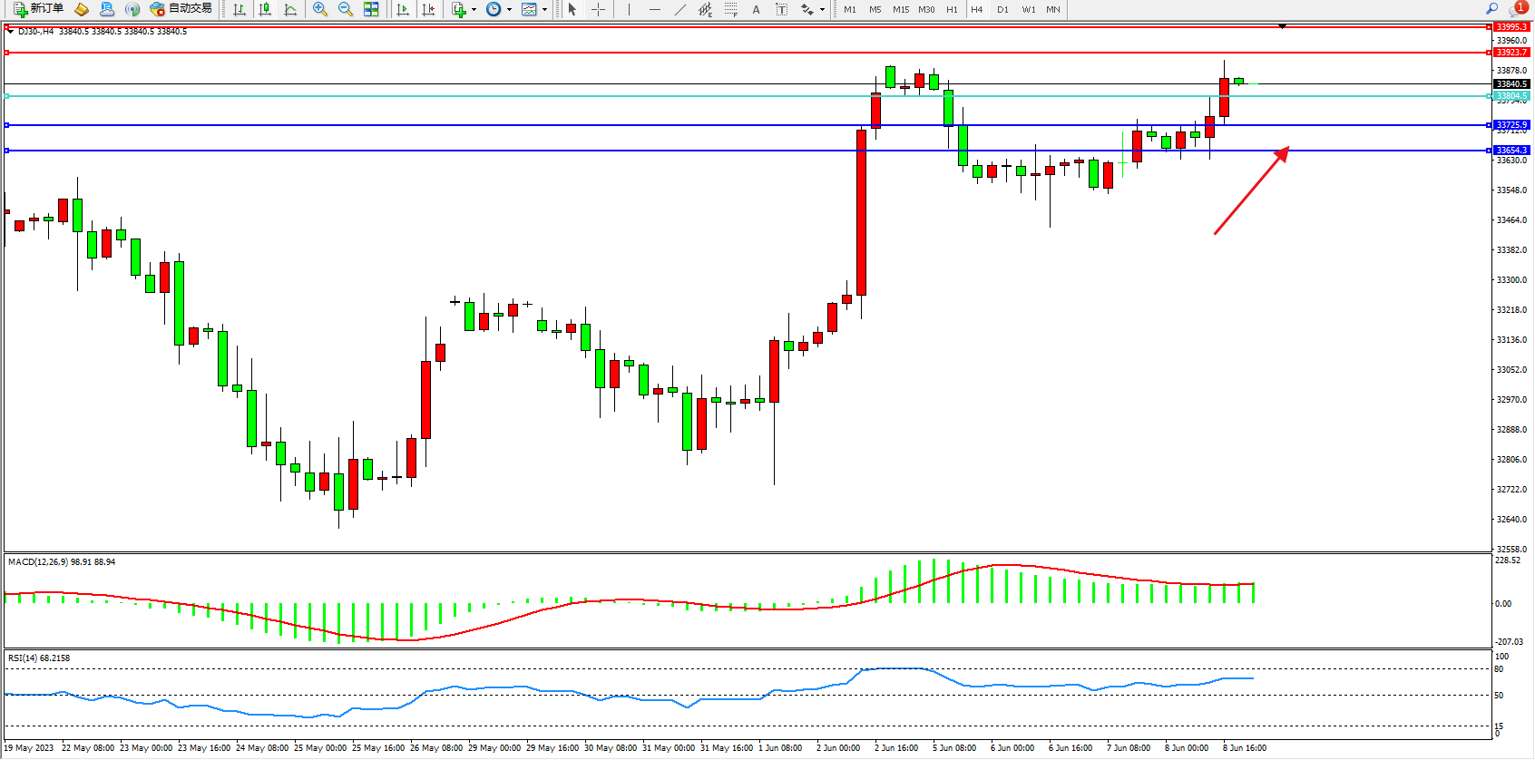 道琼斯指数DJ30——4小时K线图显示: