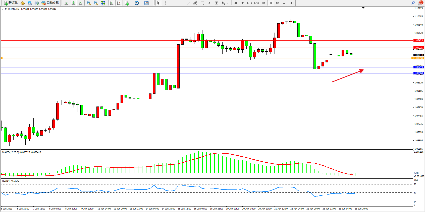 欧元美元EURUSD—4小时K线图显示: