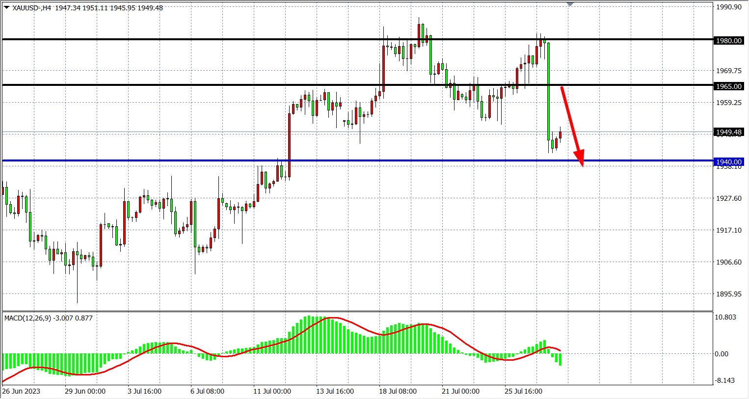周四(7月27日)美国二季度GDP意外加速增长,6月耐用品订单增速也远超预期,增加“软着陆”的预期,另外,欧洲央行如期加息25个基点后,暗示可能不会进一步加息。受此提振,美指止跌反弹,现货黄金一度跌至1940美元附近,较日高暴跌近40美元,收跌1.37%。