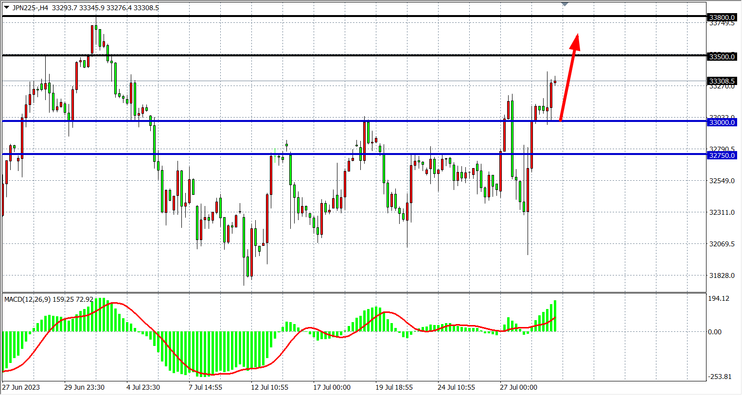 4小时图看,日经指数上破33000关口且继续走高,MACD量能在零轴之上有序放量,多头趋势延续,支撑关注33000,该位之上看33500-33800。