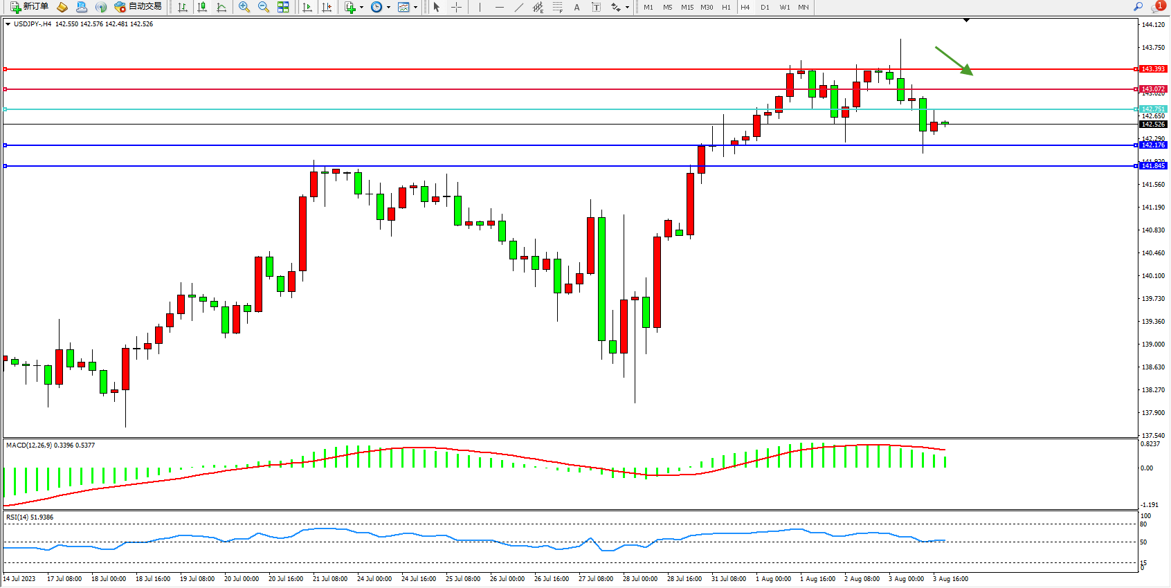 交易策略:142.751下方看跌,目标142.176 141.845