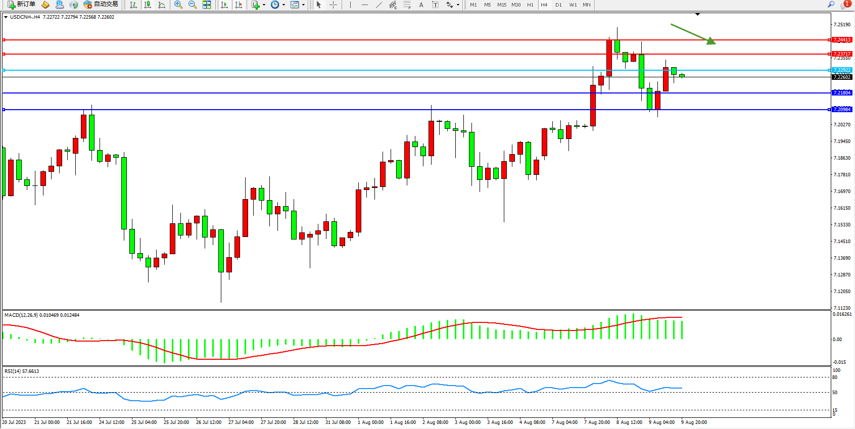 交易策略:7.22922下方看跌,目标7.21804 7.20984