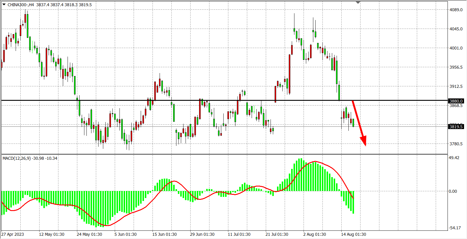 4小时图看,沪深300在3880之下继续运行,MACD量能在零轴下走强,压力继续关注3880附近,下方支撑关注3800-3770一线。