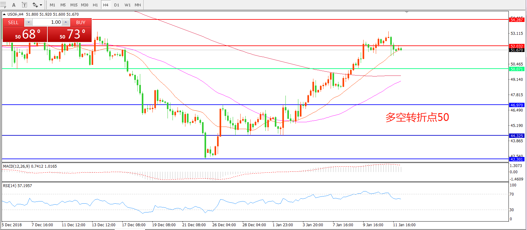 4小时图看,油价站稳50美金后稳步上行,冲击52美元后小幅回落, 均线系统仍呈多头排列,但MACD红柱缩短,短线有回落风险。