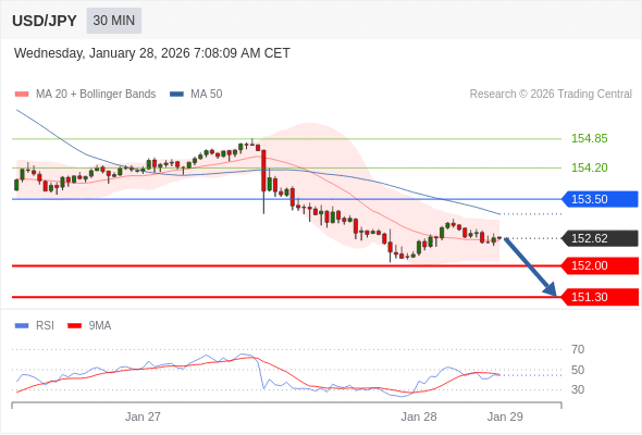 在 153.50 之下,看跌,目标价位为 152.00 ,然后为 151.30 。