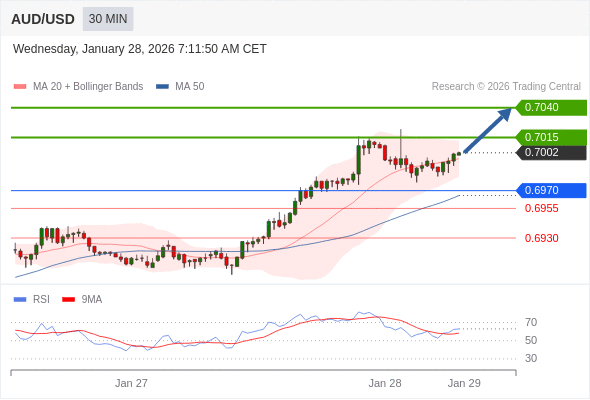 在 0.6970 之上,看涨,目标价位为 0.7015 ,然后为 0.7040 。
