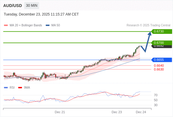 在 0.6655 之上,看涨,目标价位为 0.6700 ,然后为 0.6730 。