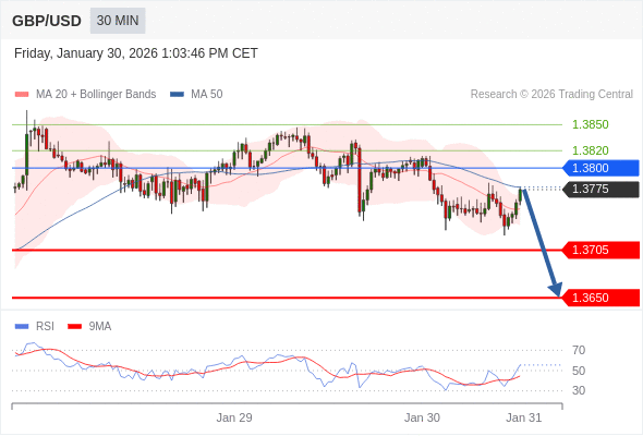 交易策略: 在 1.3800 之下,看跌,目标价位为 1.3725 ,然后为 1.3690 。