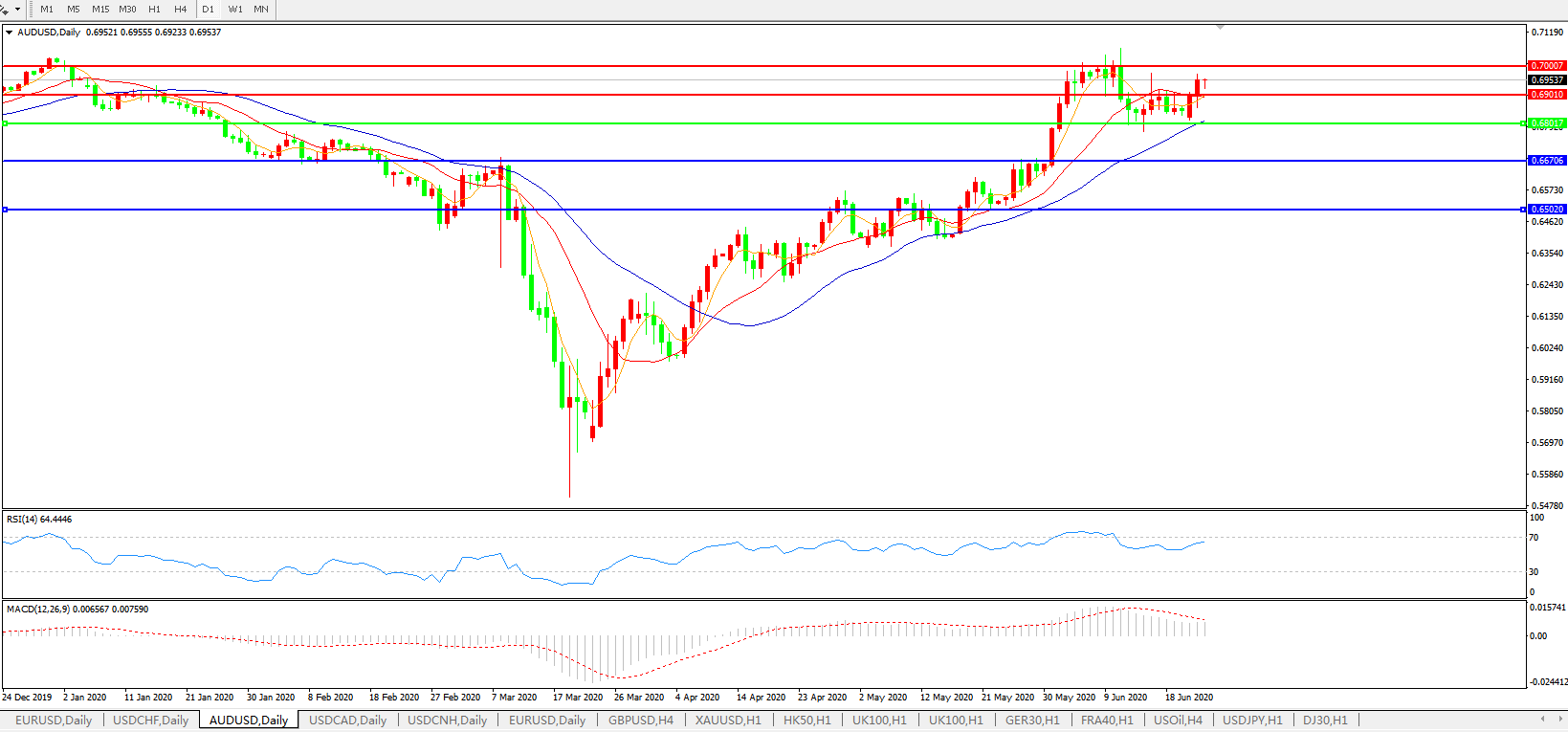 技术面简析:日图短期均线再度走强,汇价整理后持续上攻,MACD运行于0轴上方且量能开始放量,RSI缓步走升,预计汇价短线大概率将继续走升,关注0.70关口压制。