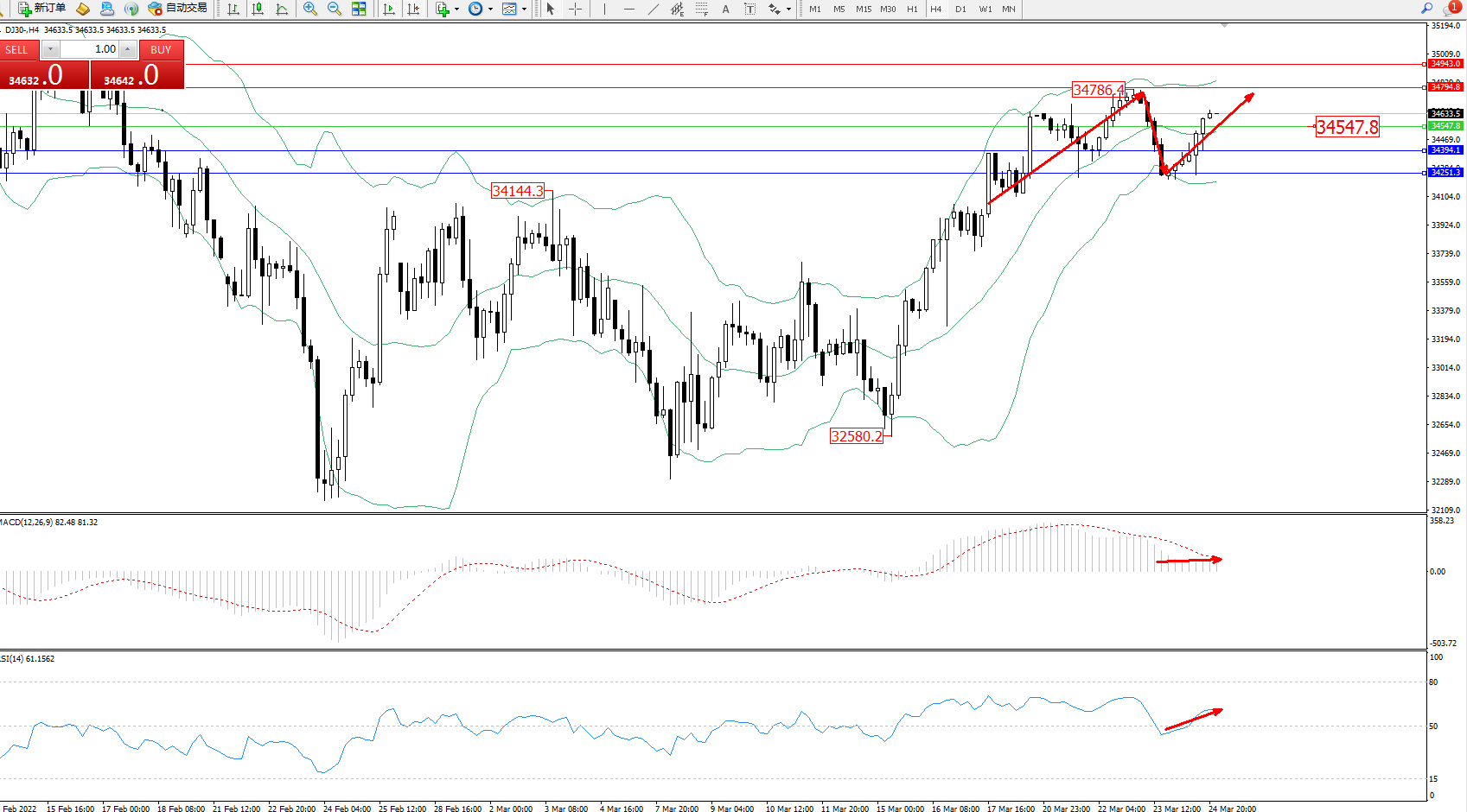 道琼斯指数DJ30——4小时K线图显示: