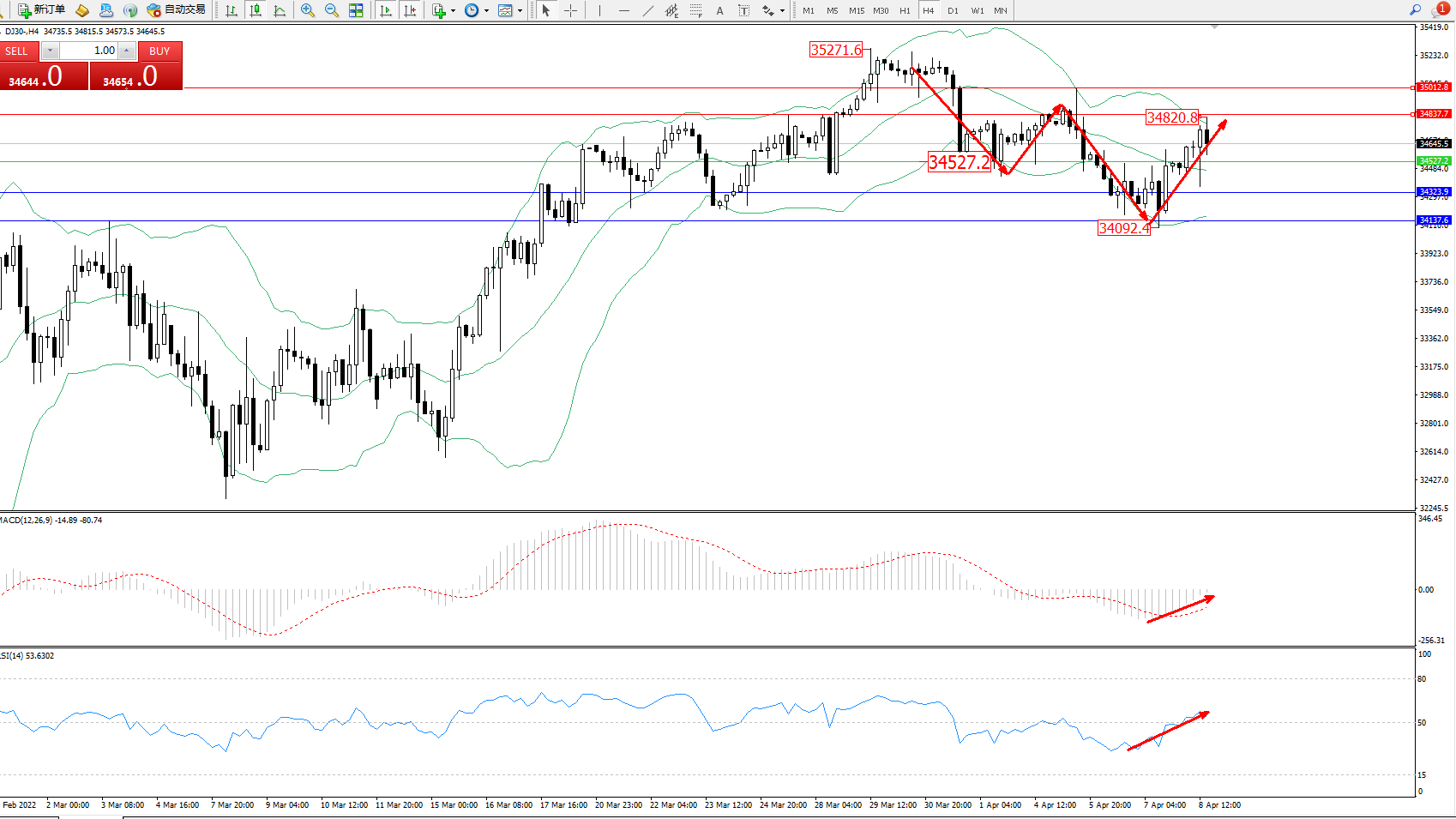 技术点评:空头动力延续布林带指标通道内呈阶梯式震荡下行,低位抵达34092位置节点后反转震荡上扬,触及布林带指标上轨34820附近节点后震荡,短期多头动力有伺机入场强势拉升态势,布林带指标呈收口走势中,MACD指标处于空头区域维持整理上移至0轴线附近徘徊,RSI指标低位多头动力维持震荡上移至50均衡线上方整理中;